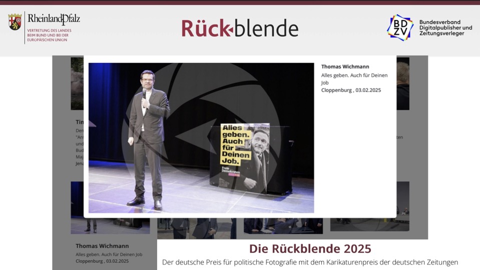 Rückblende 2025 – Der deutsche Preis für politische Fotografie mit Karikaturenpreis der deutschen Zeitungen. Thomas Wichmann – Titel des Bildes „Alles geben. Auch für Deinen Job.“ Ausgewählter Beitrag für die Ausstellung https://rueckblende.rlp.de/ausstellung